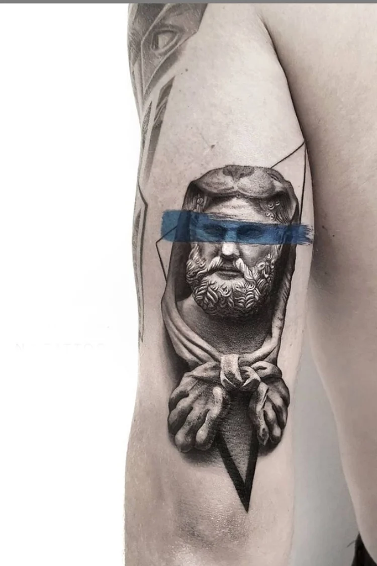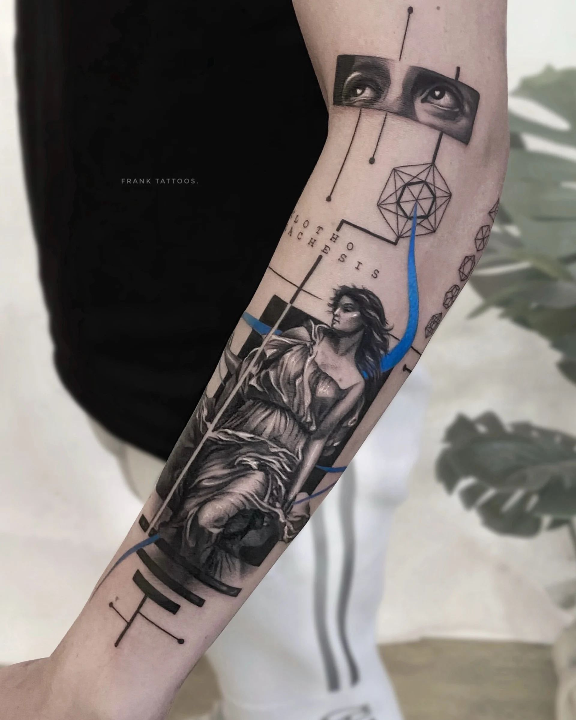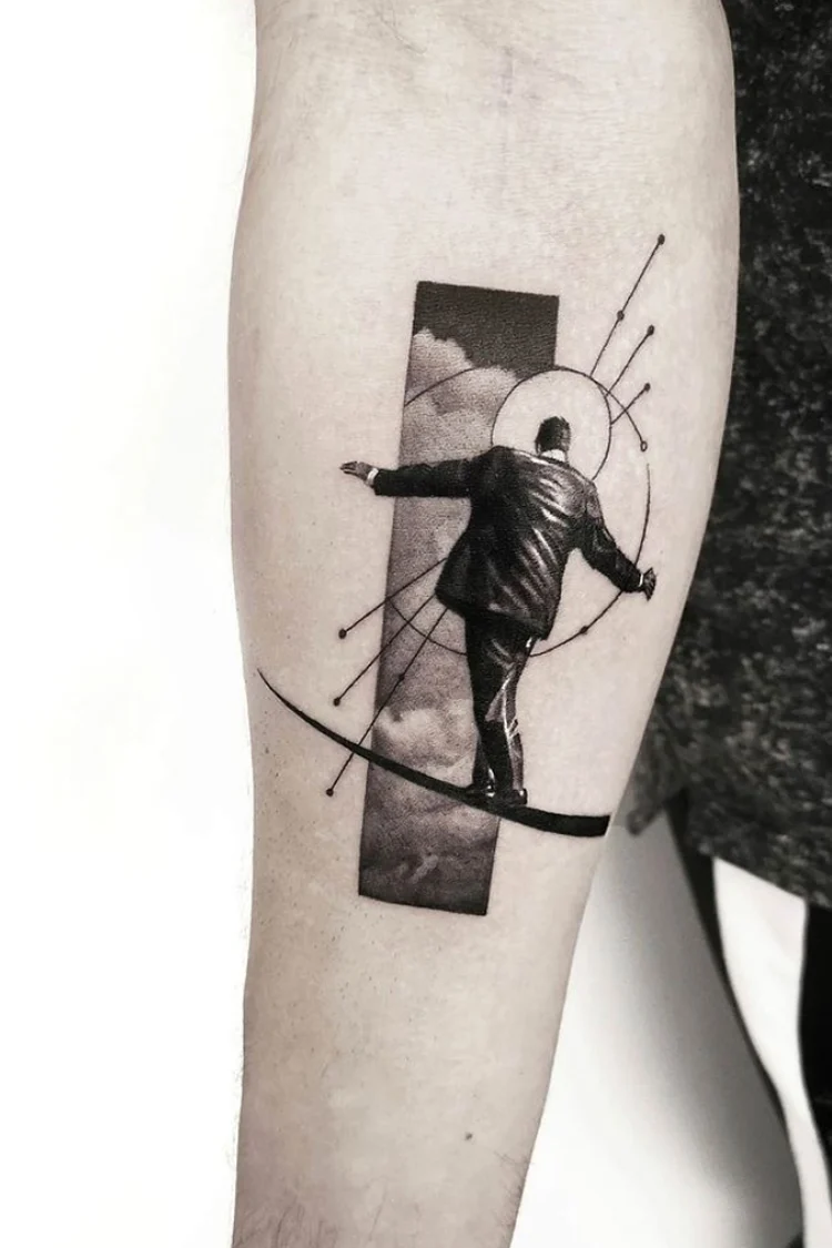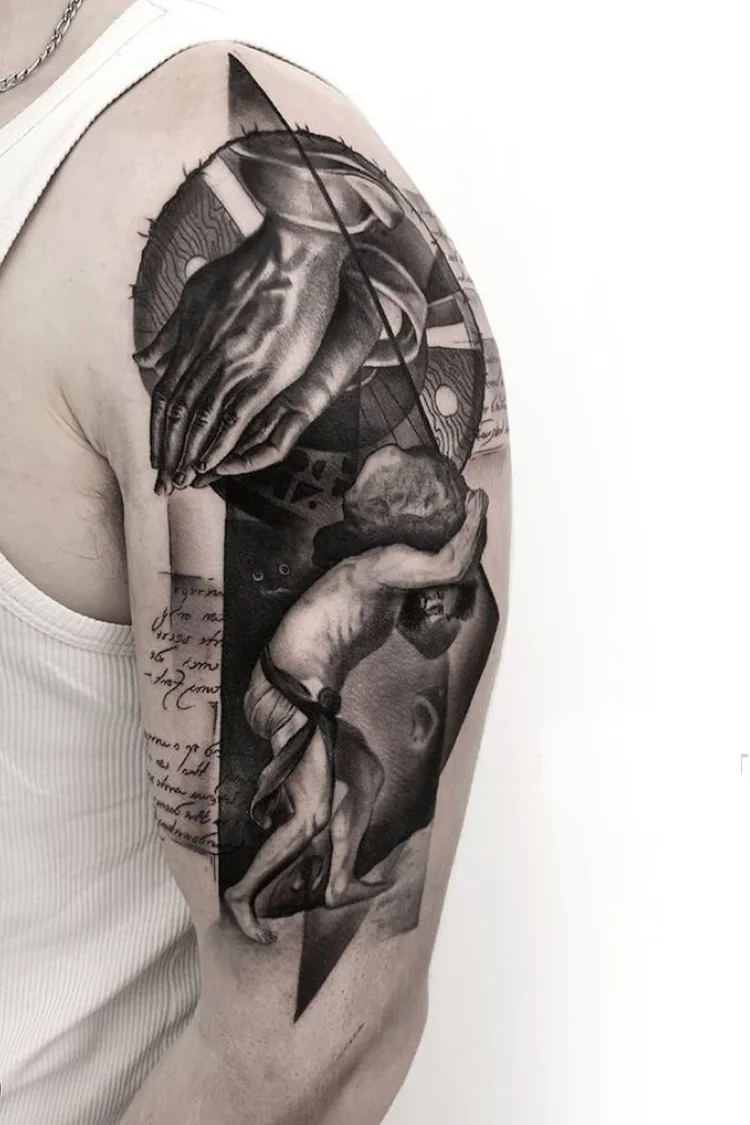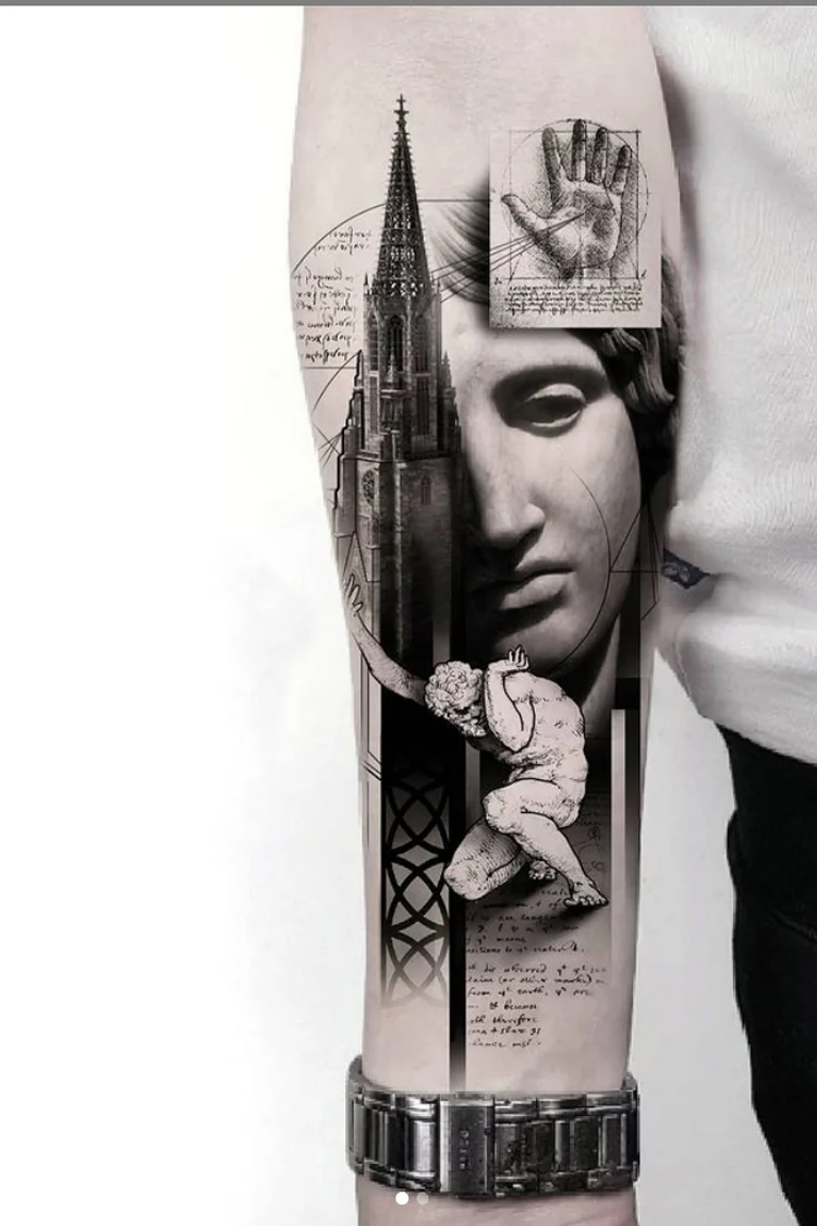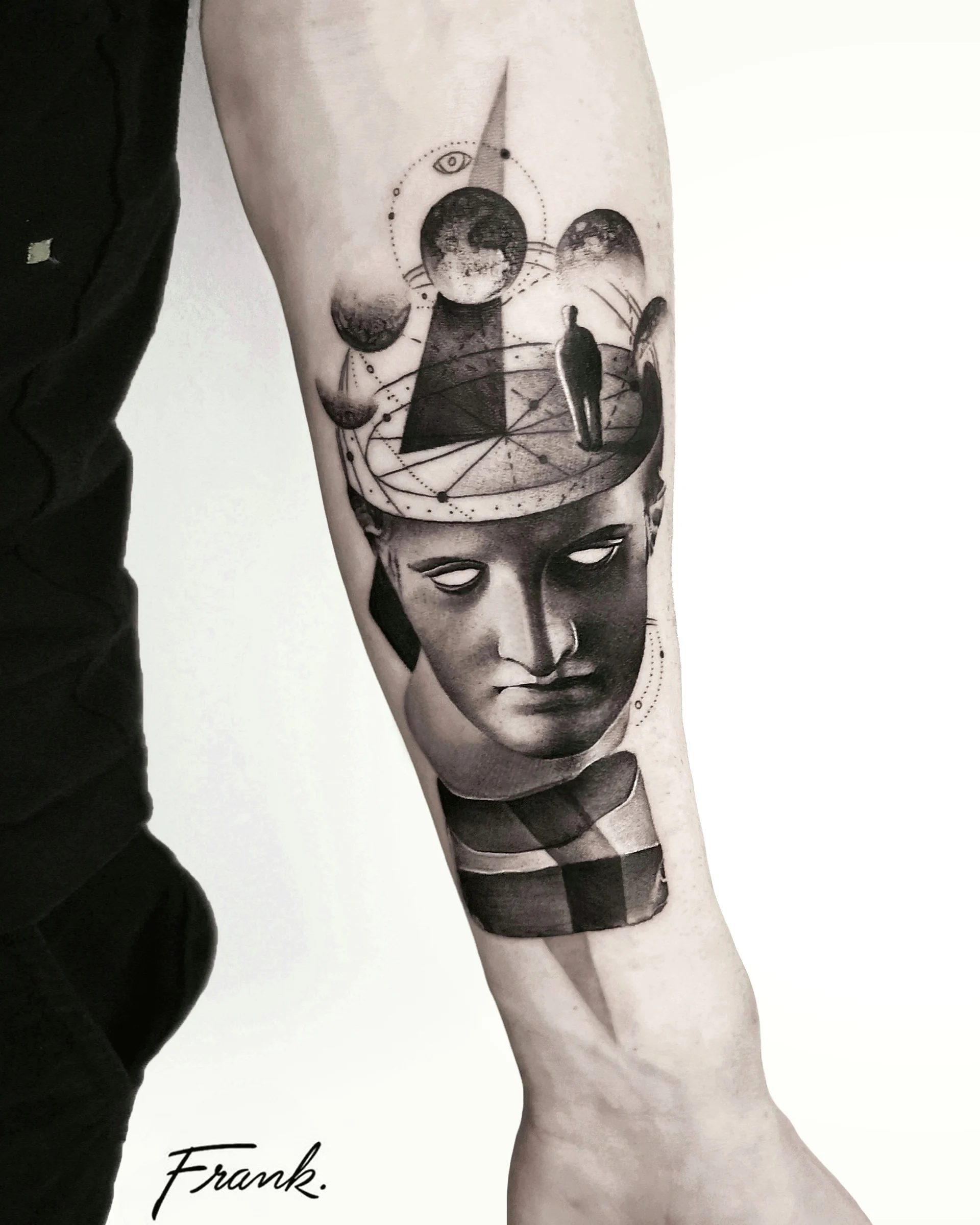 He specialises in black and white realistic tattoos, with a tendency to add a lot of geometric shapes.