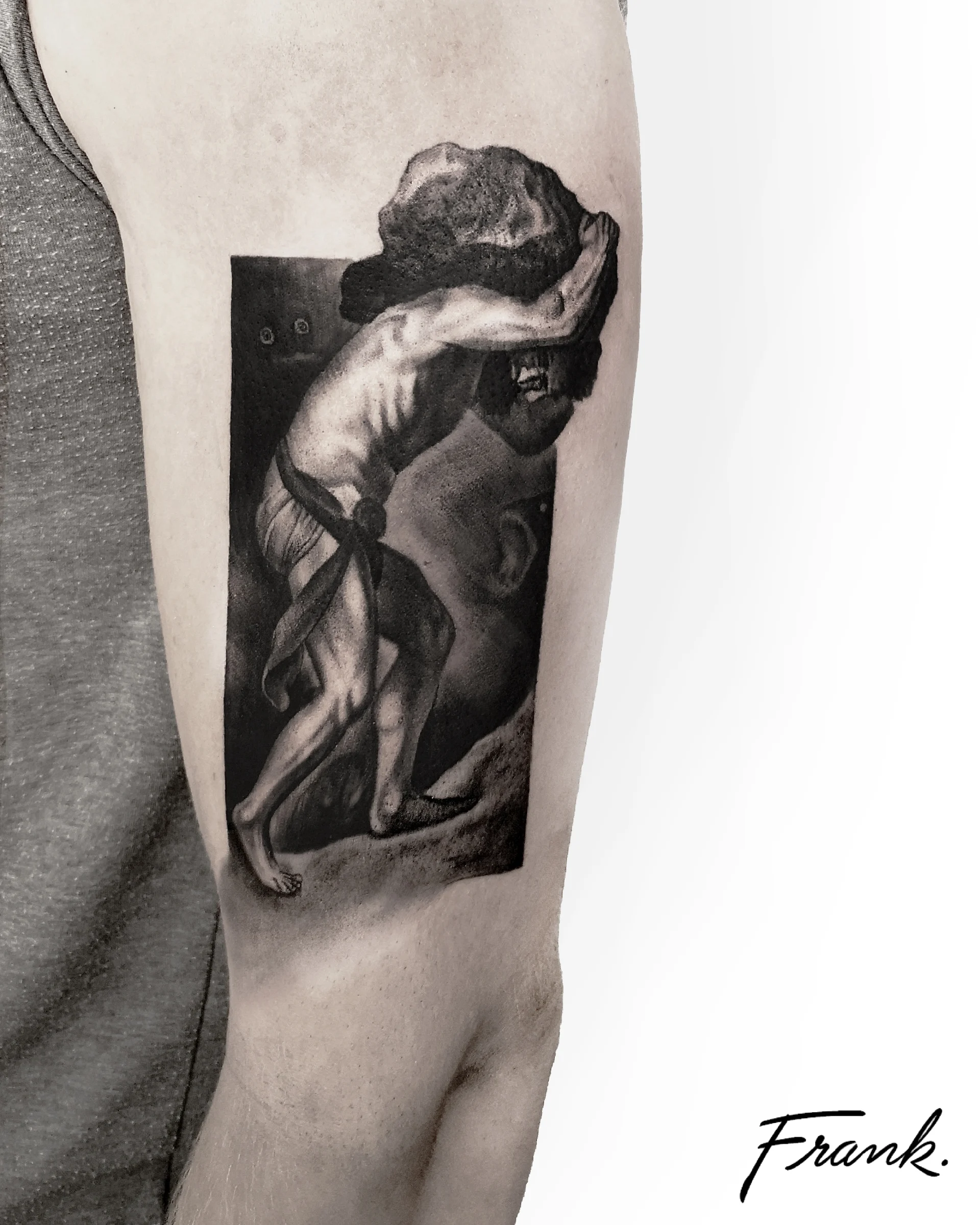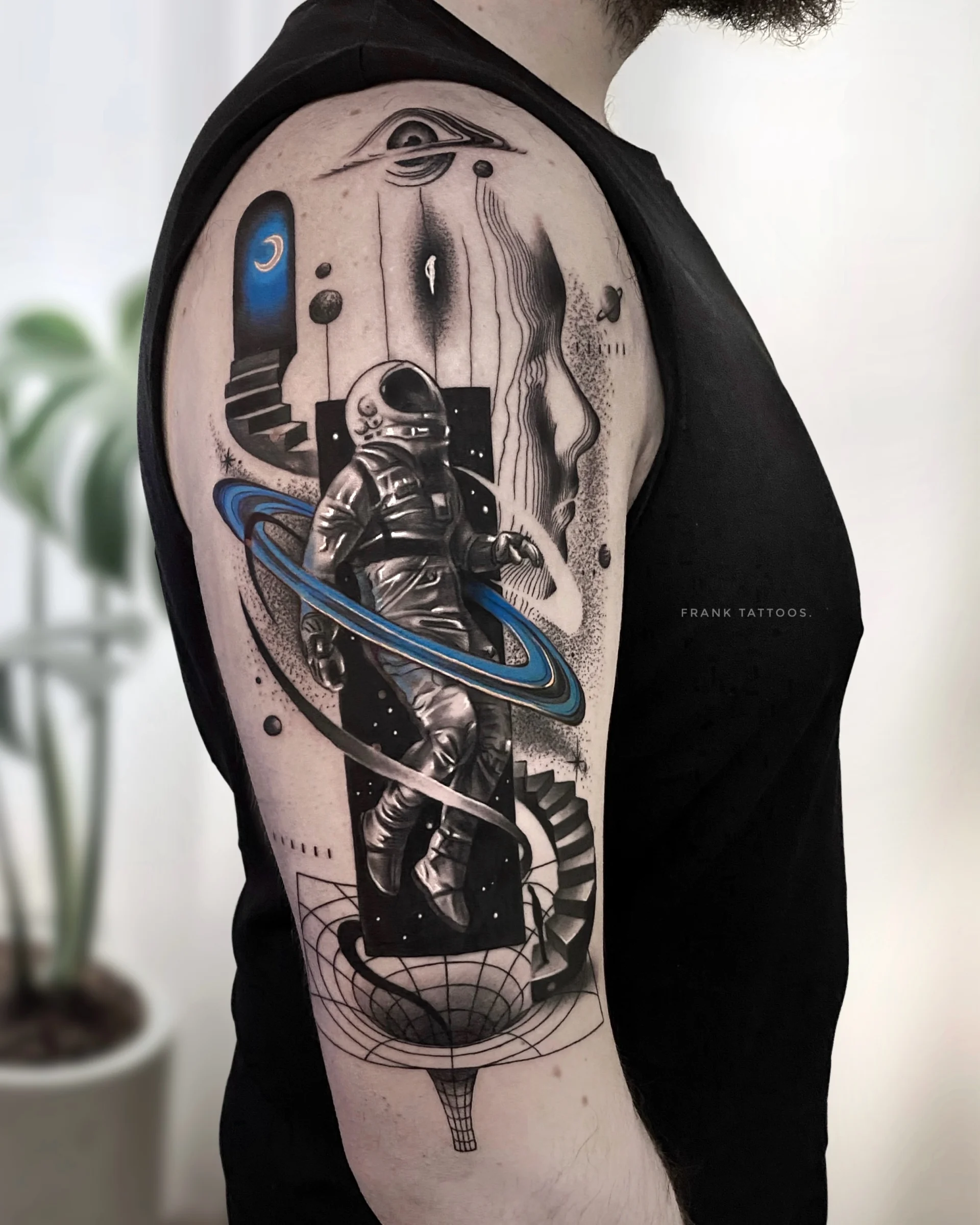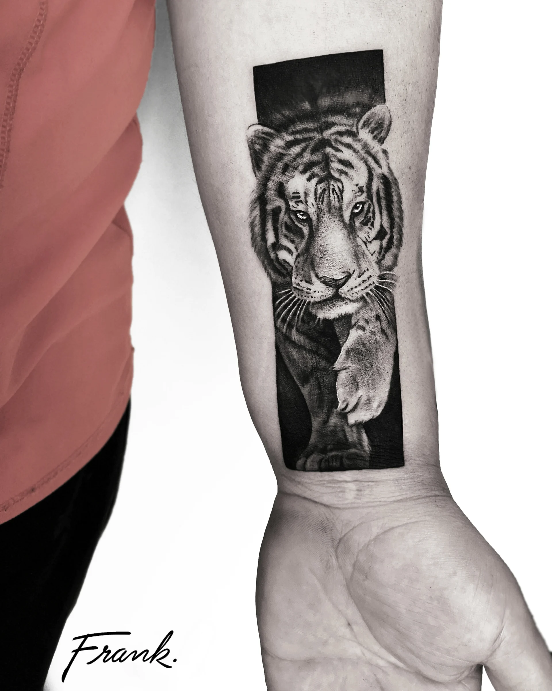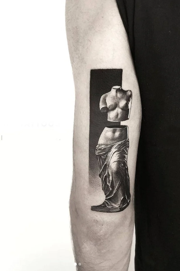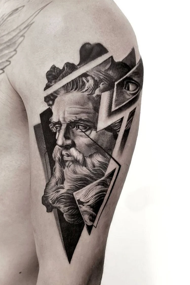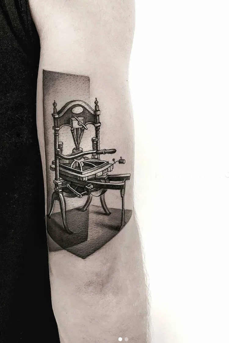 He specialises in black and white realistic tattoos, with a tendency to add a lot of geometric shapes.