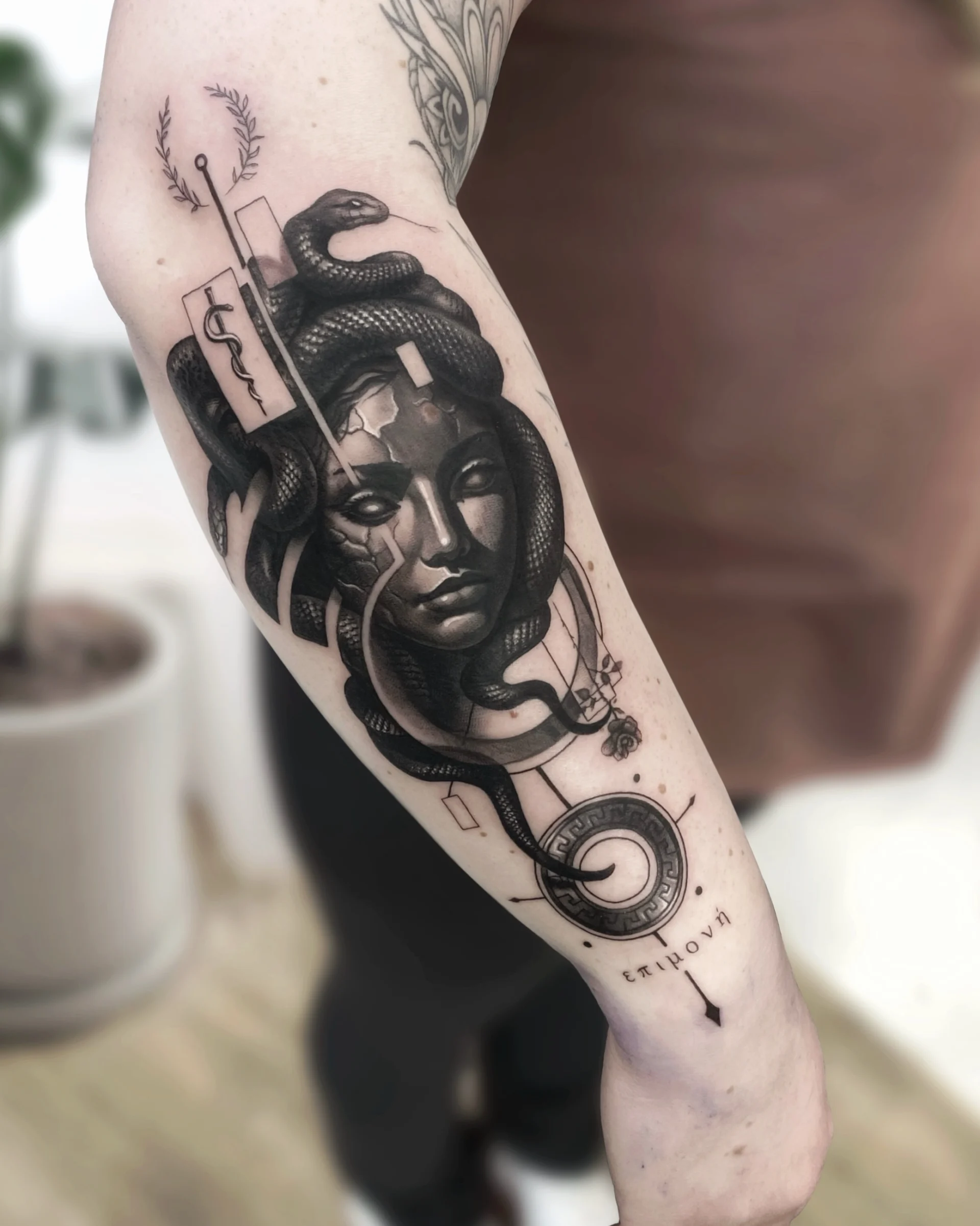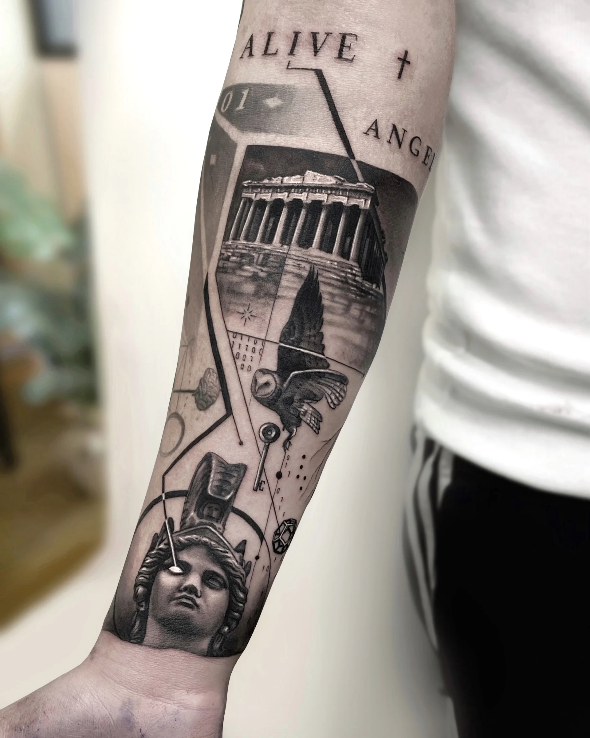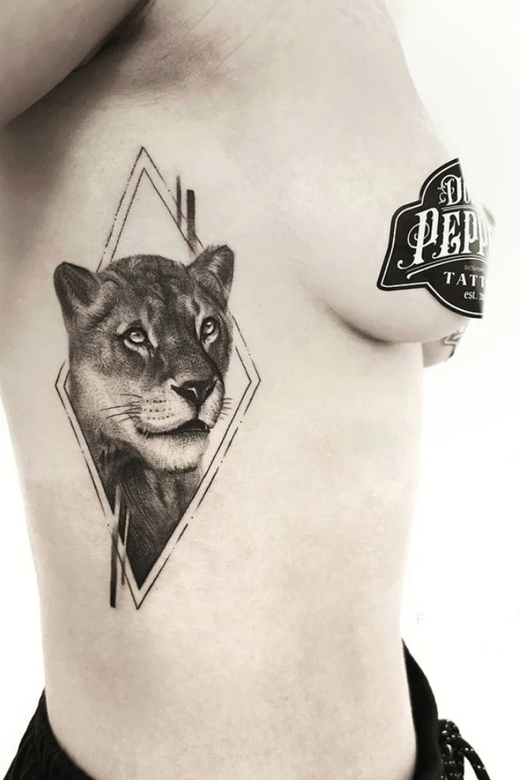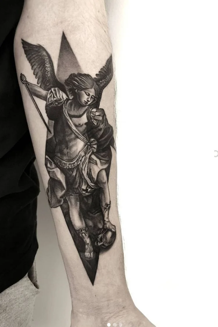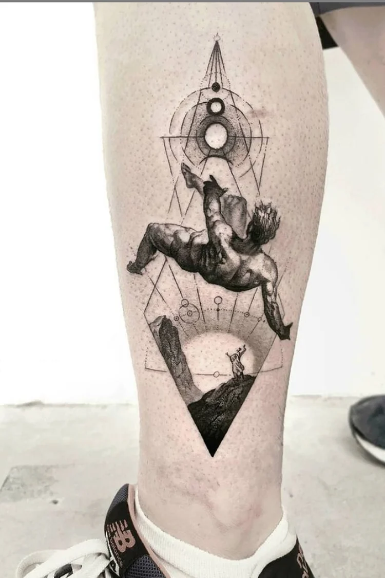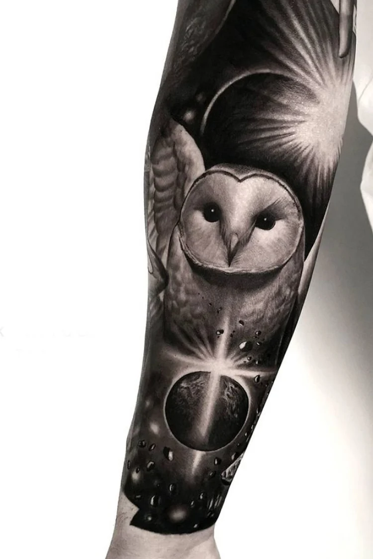 He specialises in black and white realistic tattoos, with a tendency to add a lot of geometric shapes.