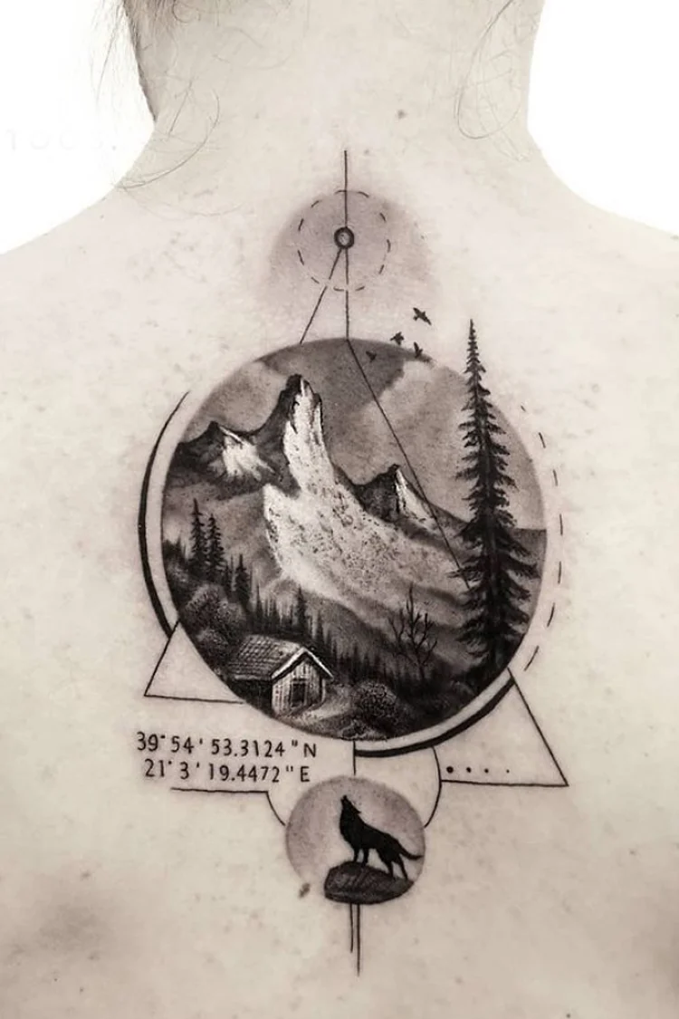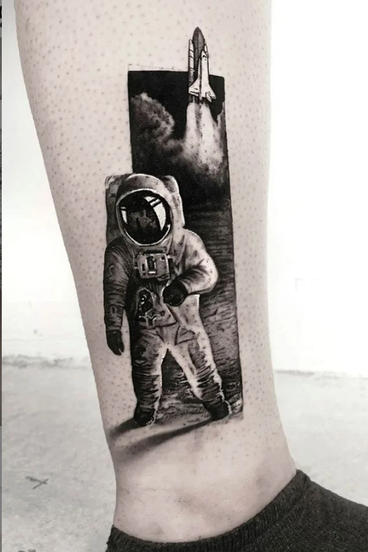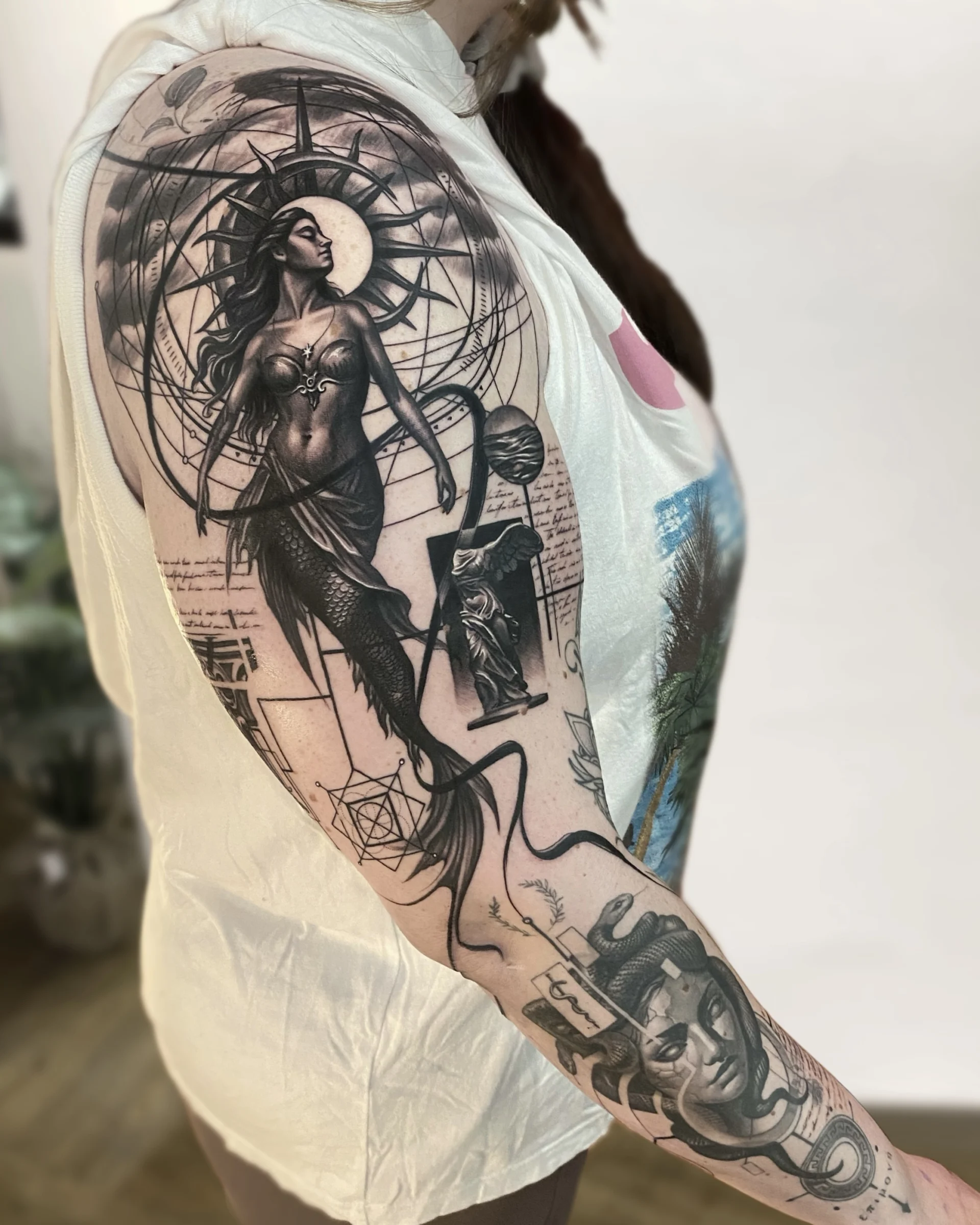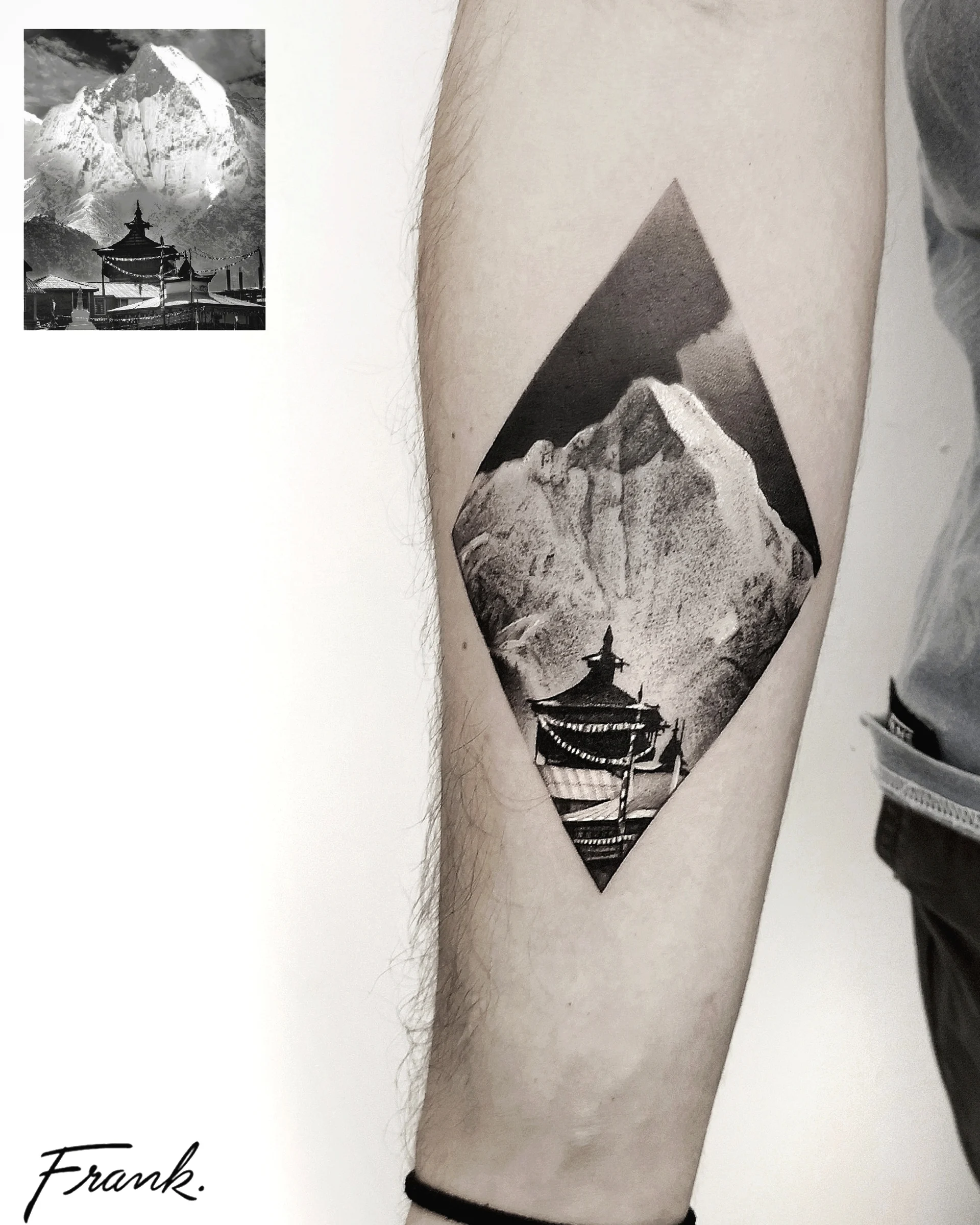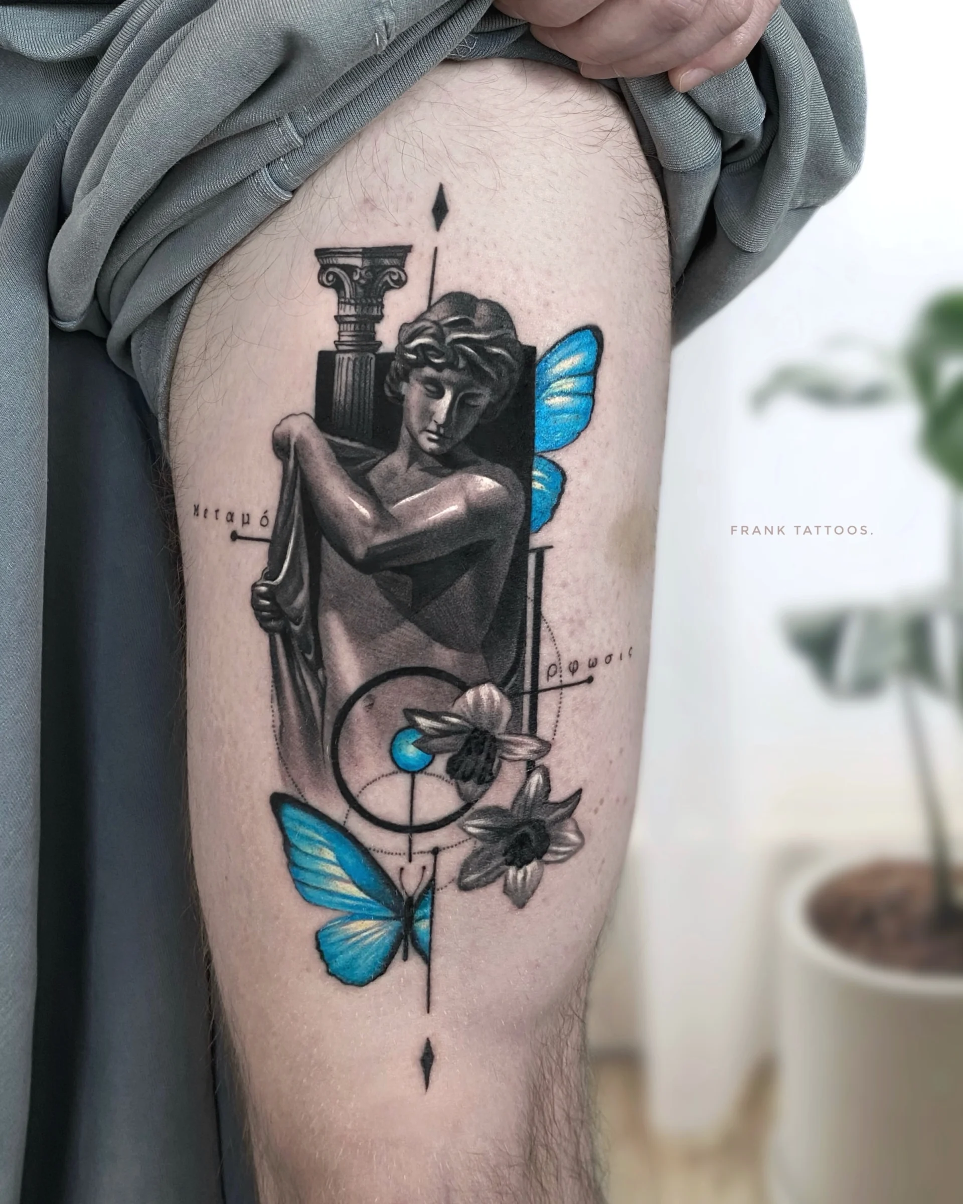He specialises in black and white realistic tattoos, with a tendency to add a lot of geometric shapes.