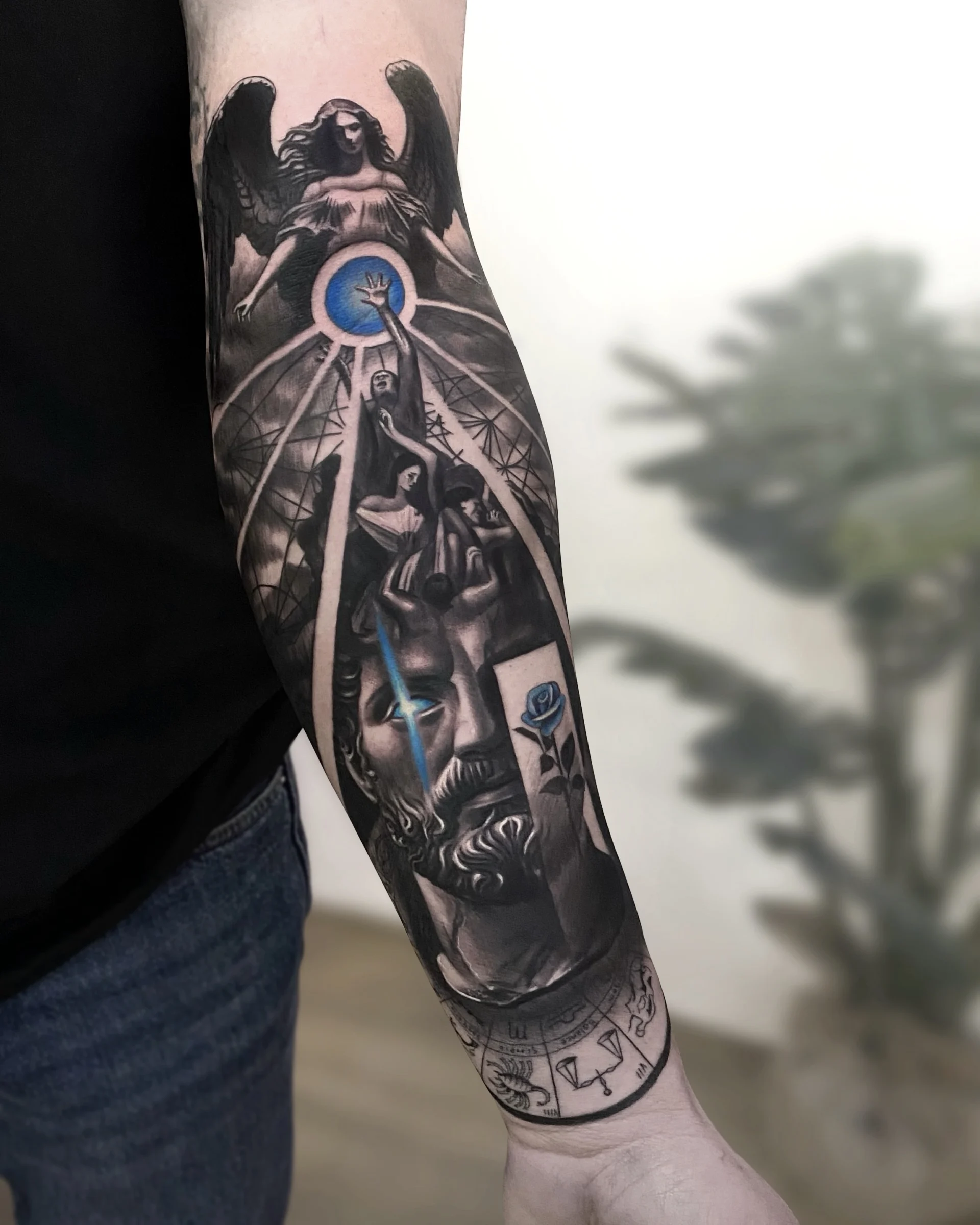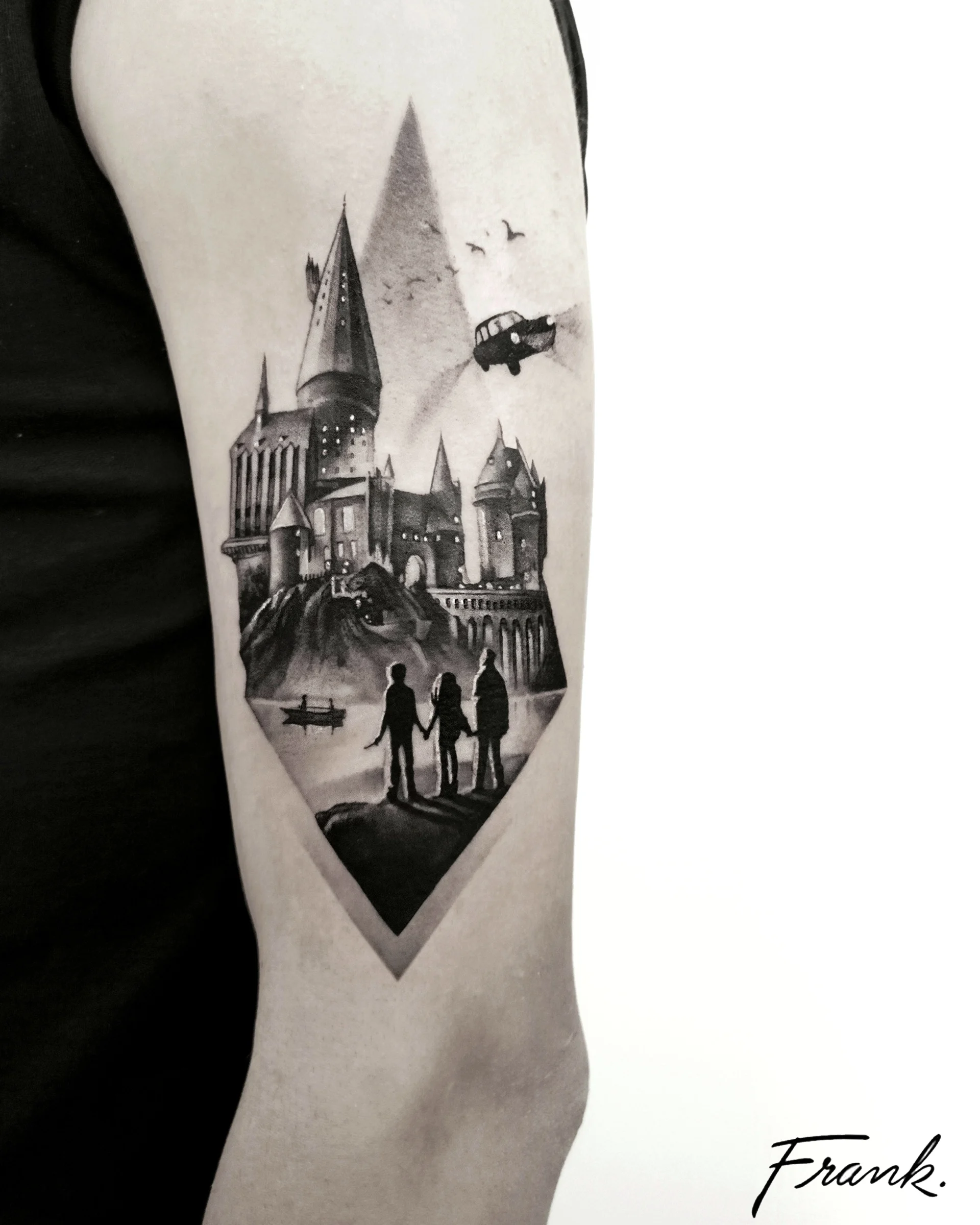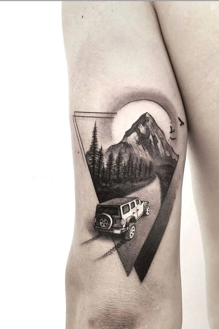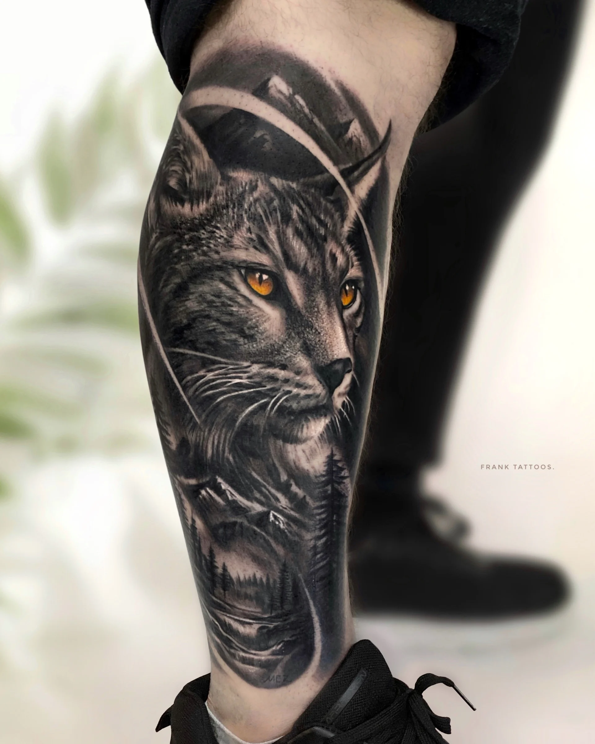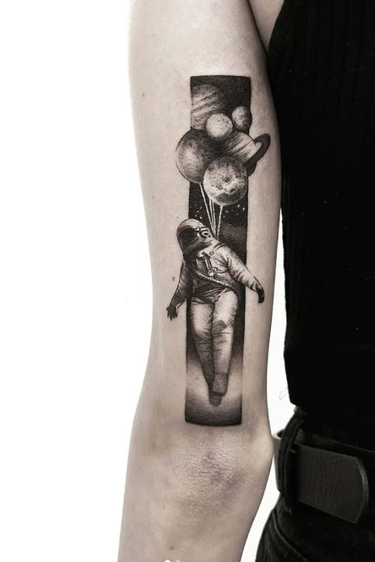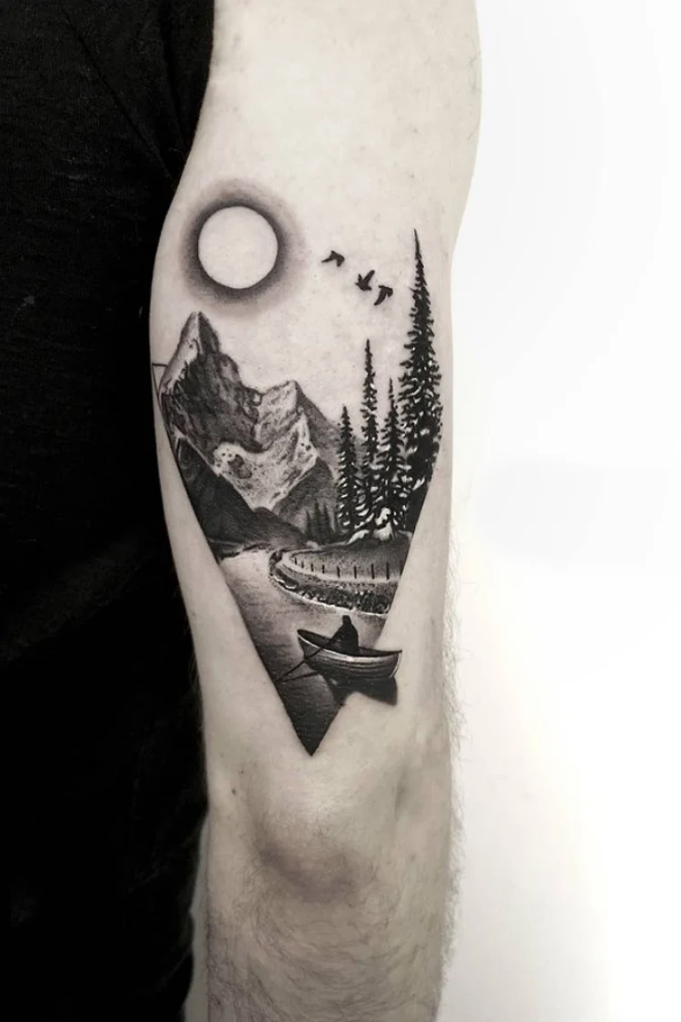 He specialises in black and white realistic tattoos, with a tendency to add a lot of geometric shapes.