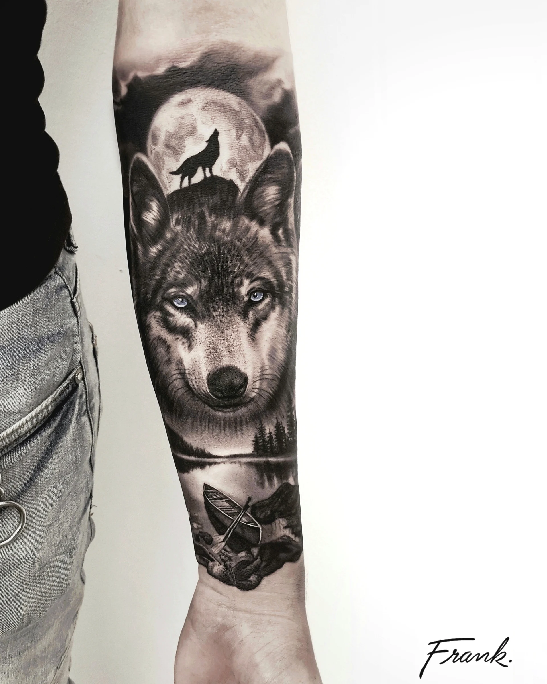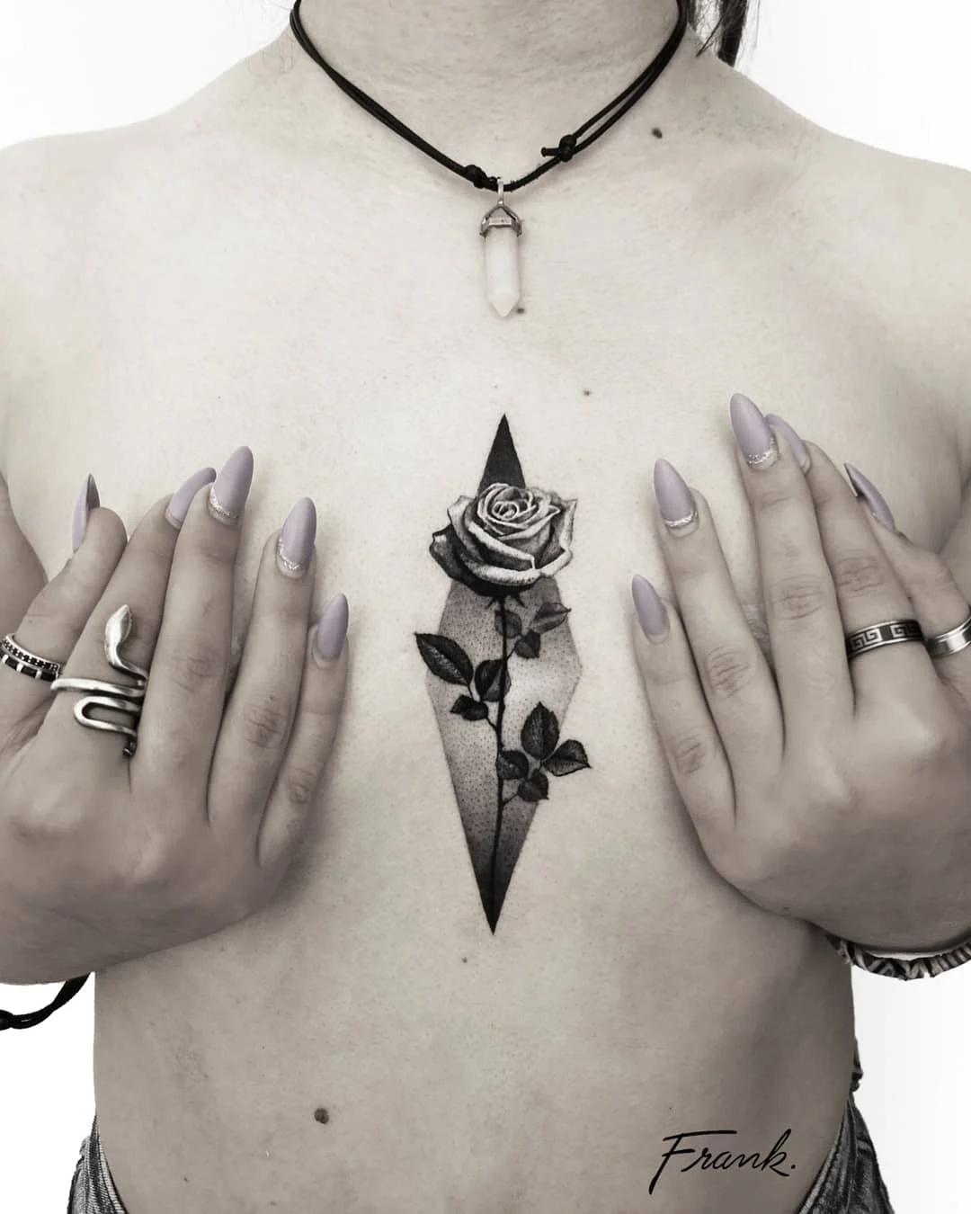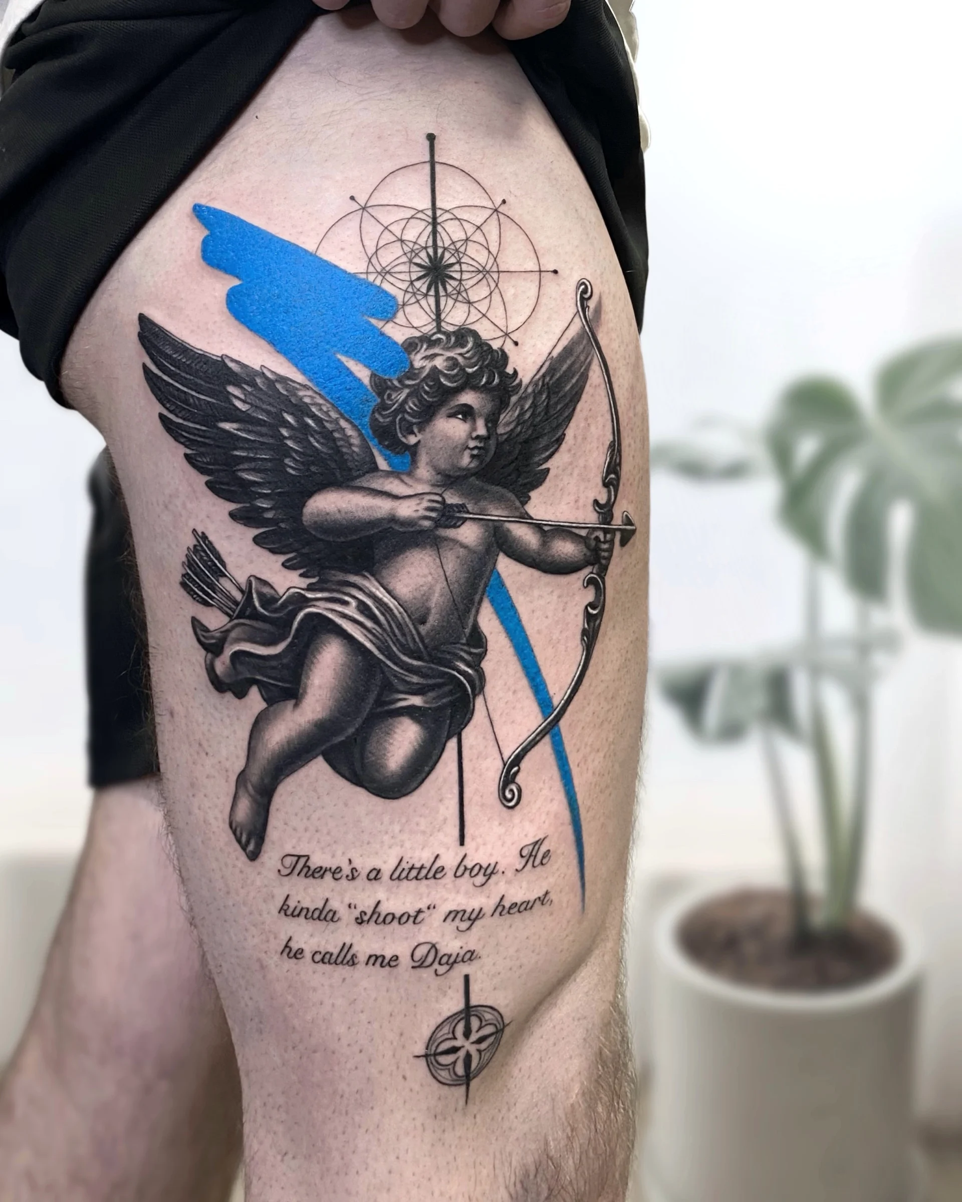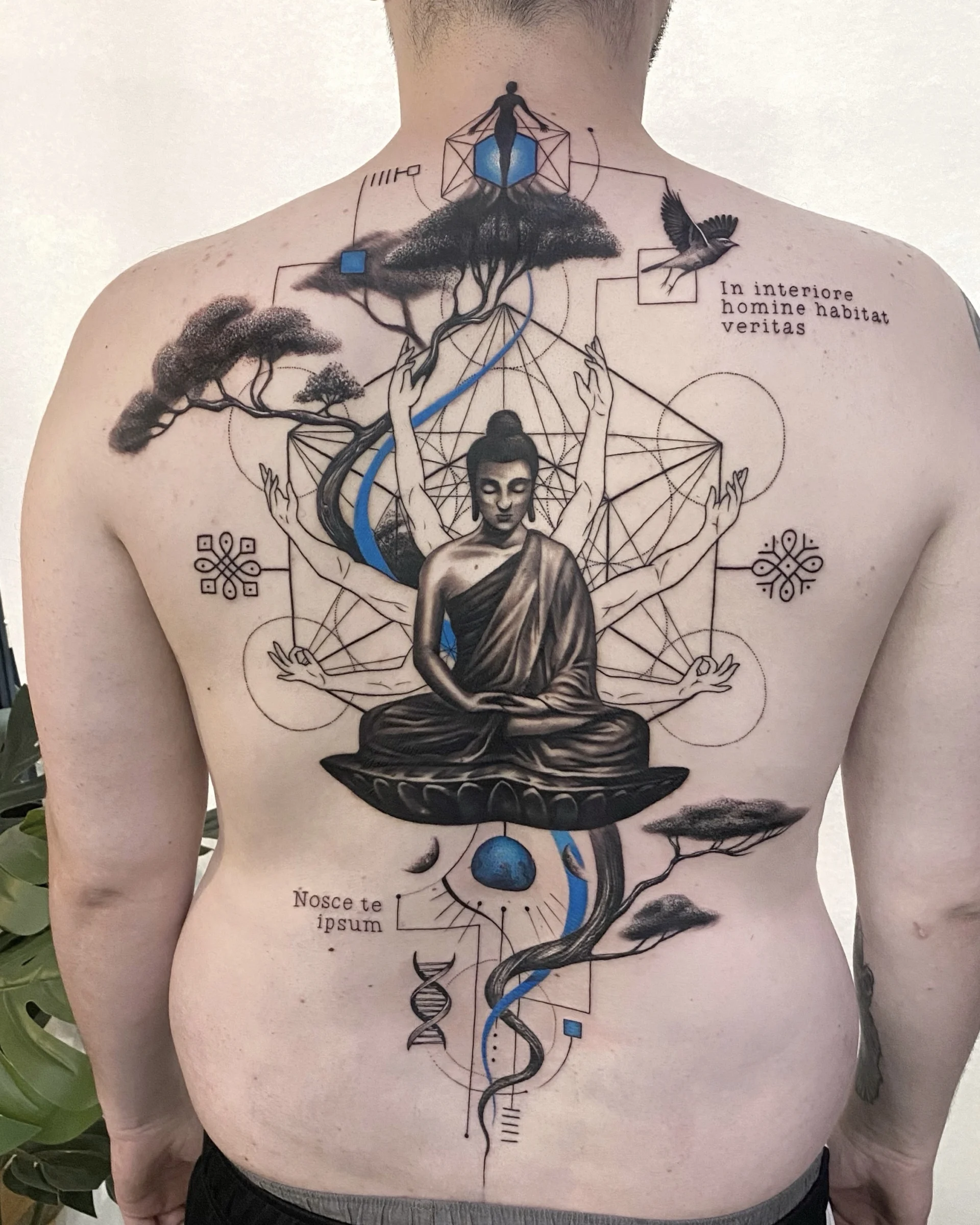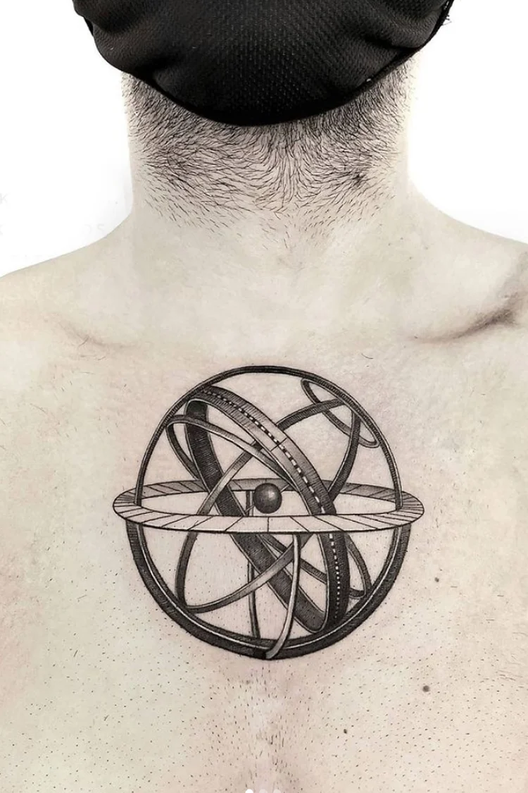 He specialises in black and white realistic tattoos, with a tendency to add a lot of geometric shapes.