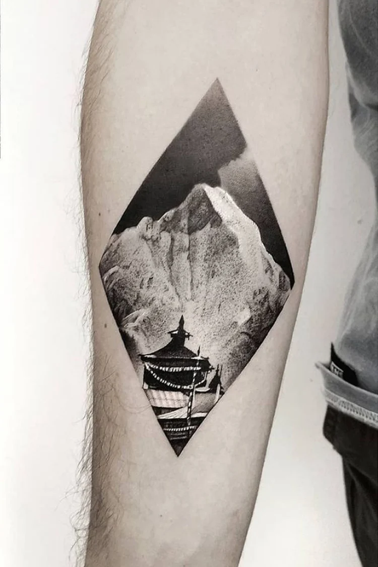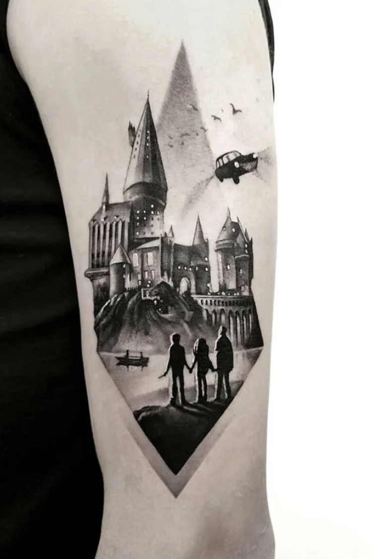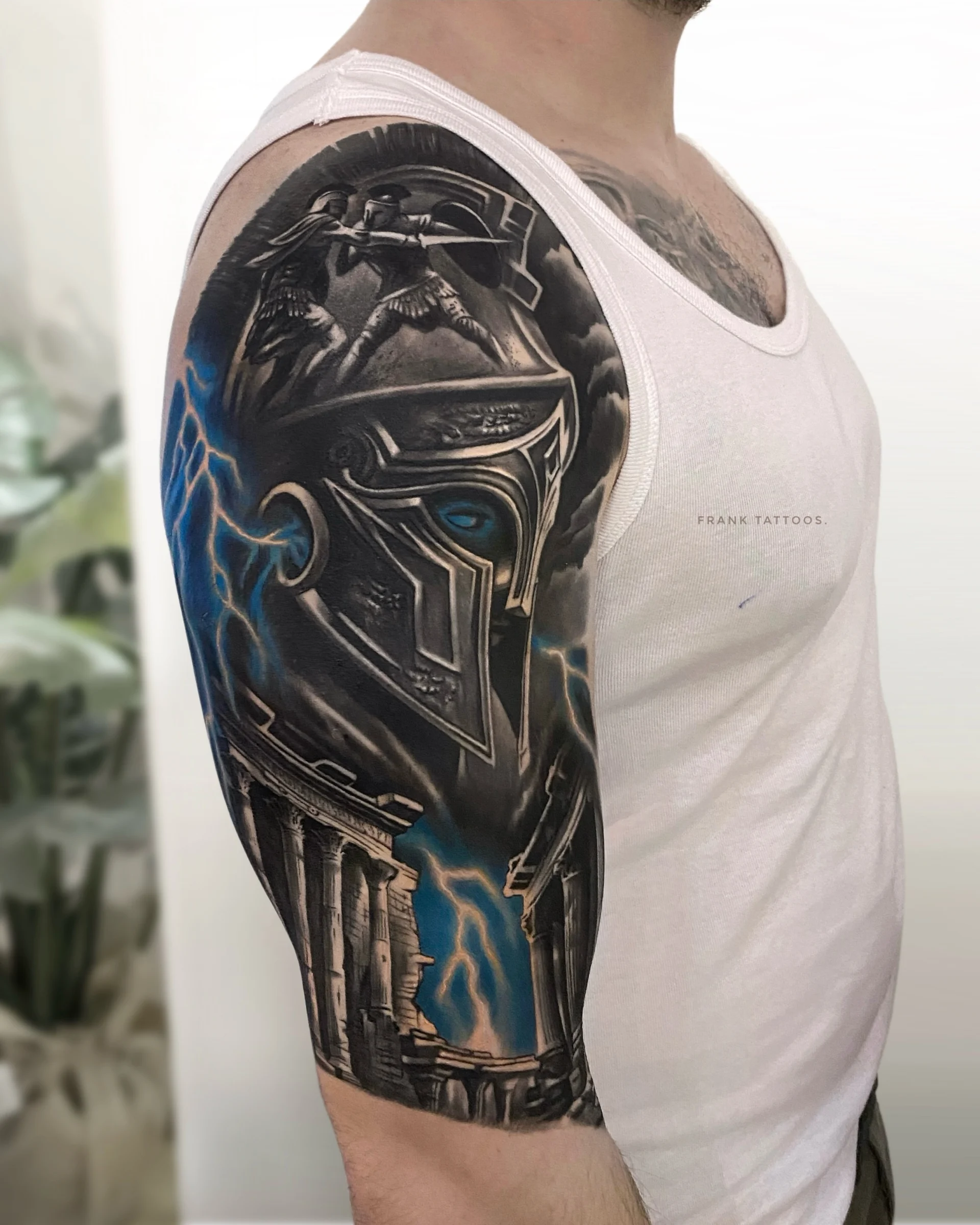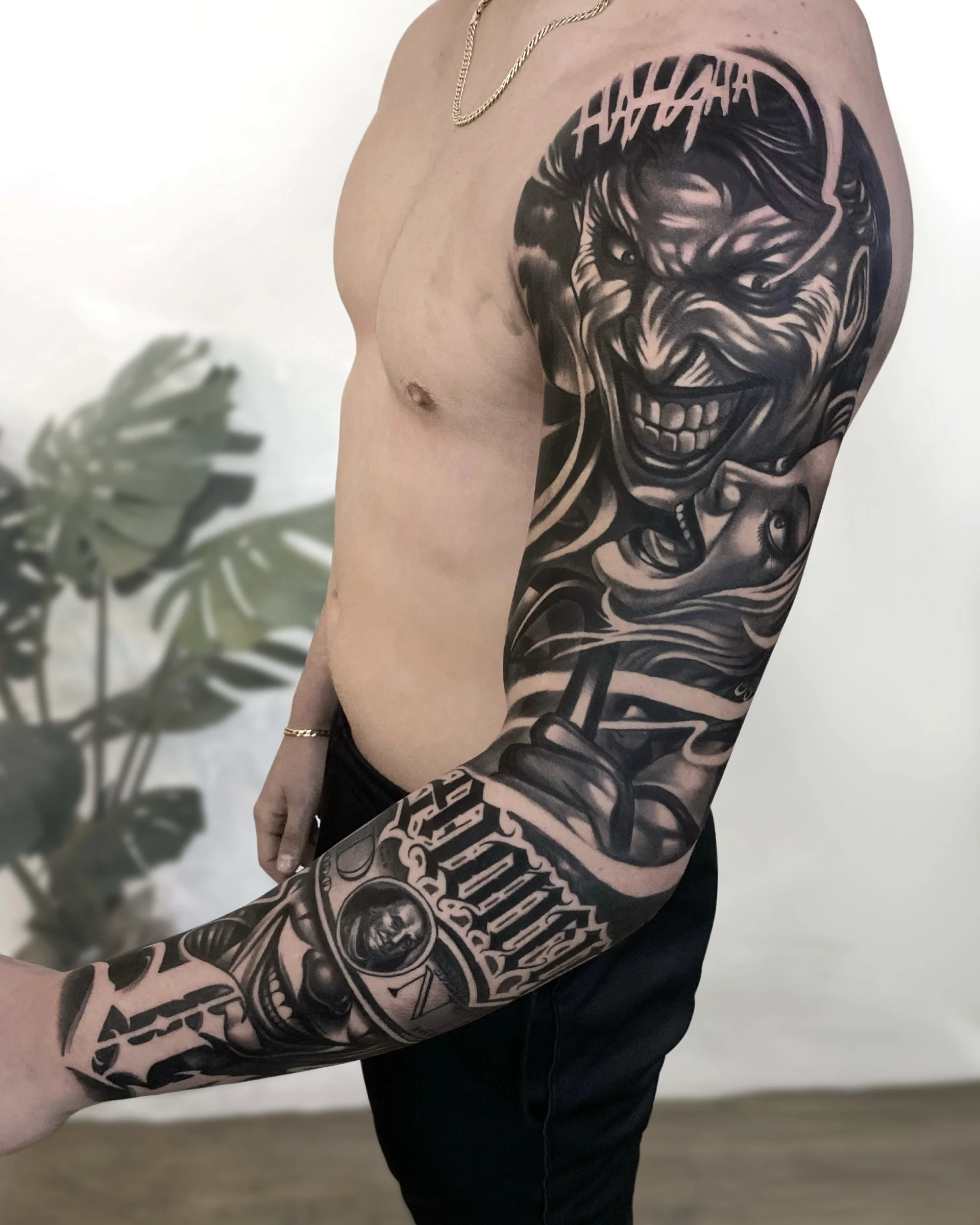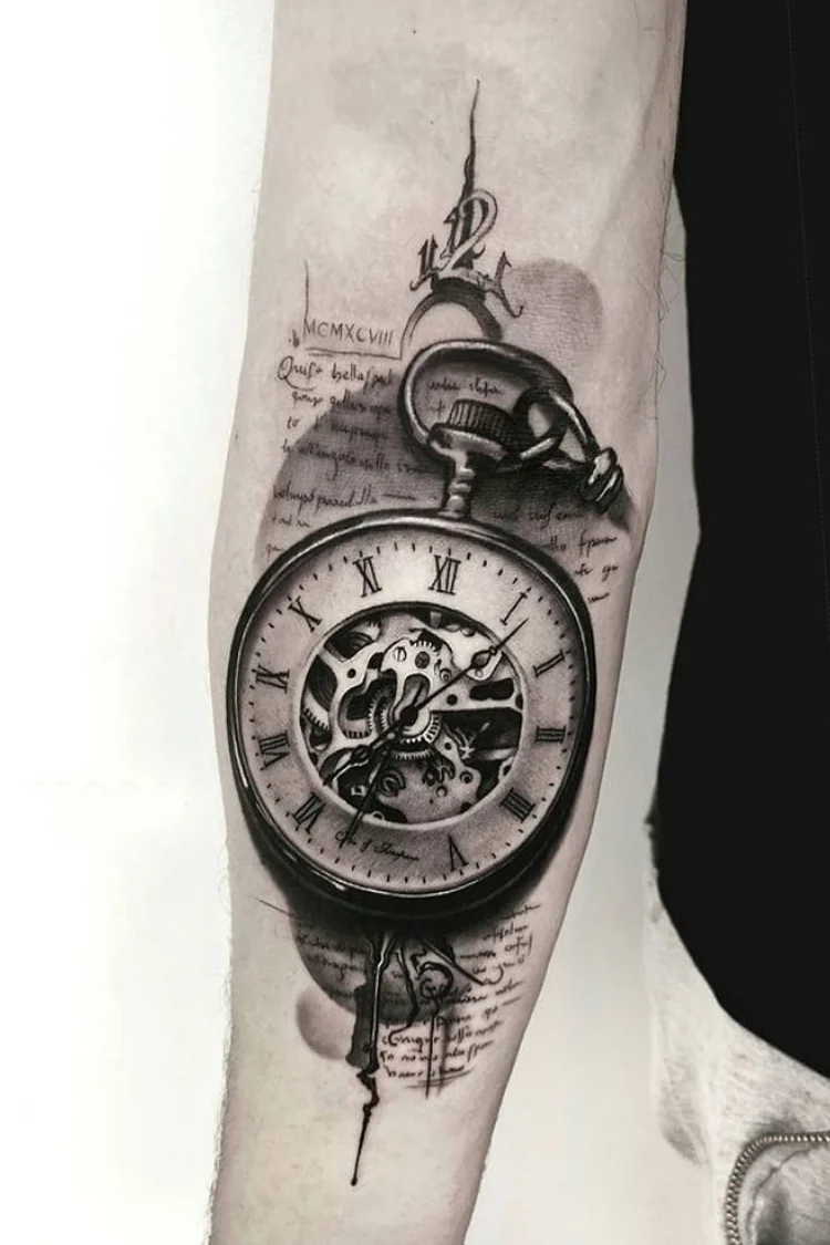 He specialises in black and white realistic tattoos, with a tendency to add a lot of geometric shapes.