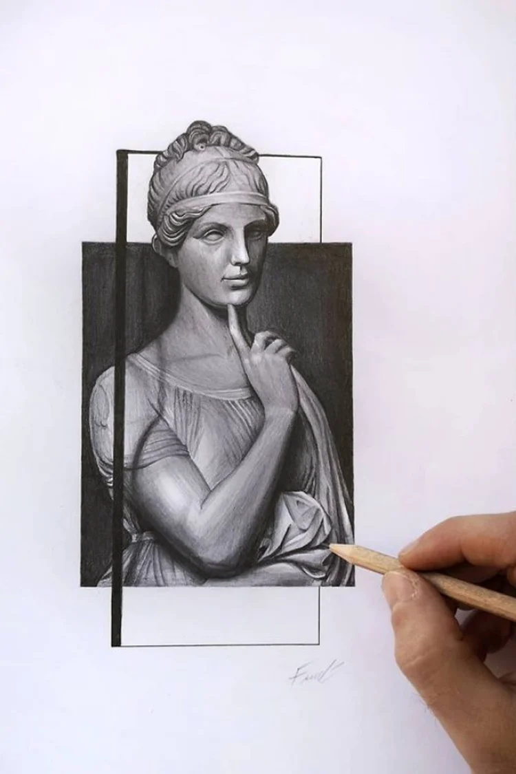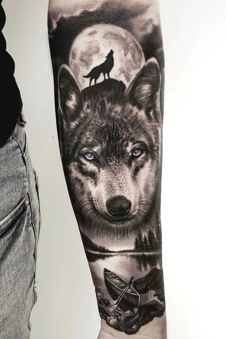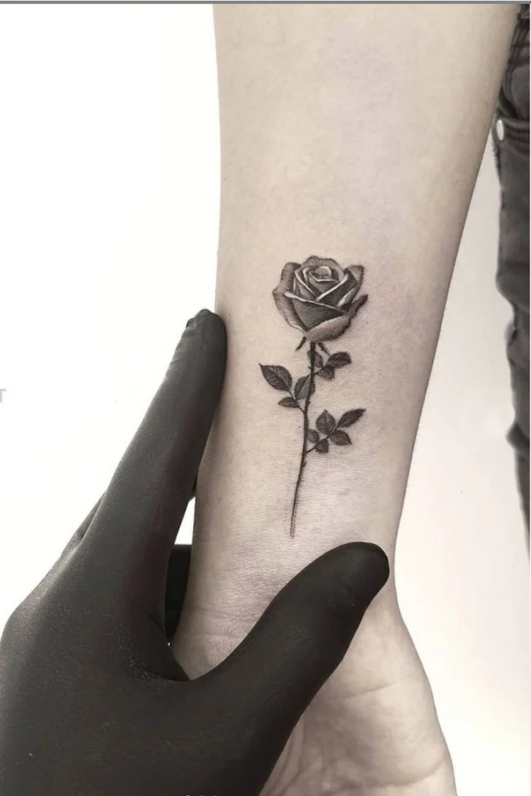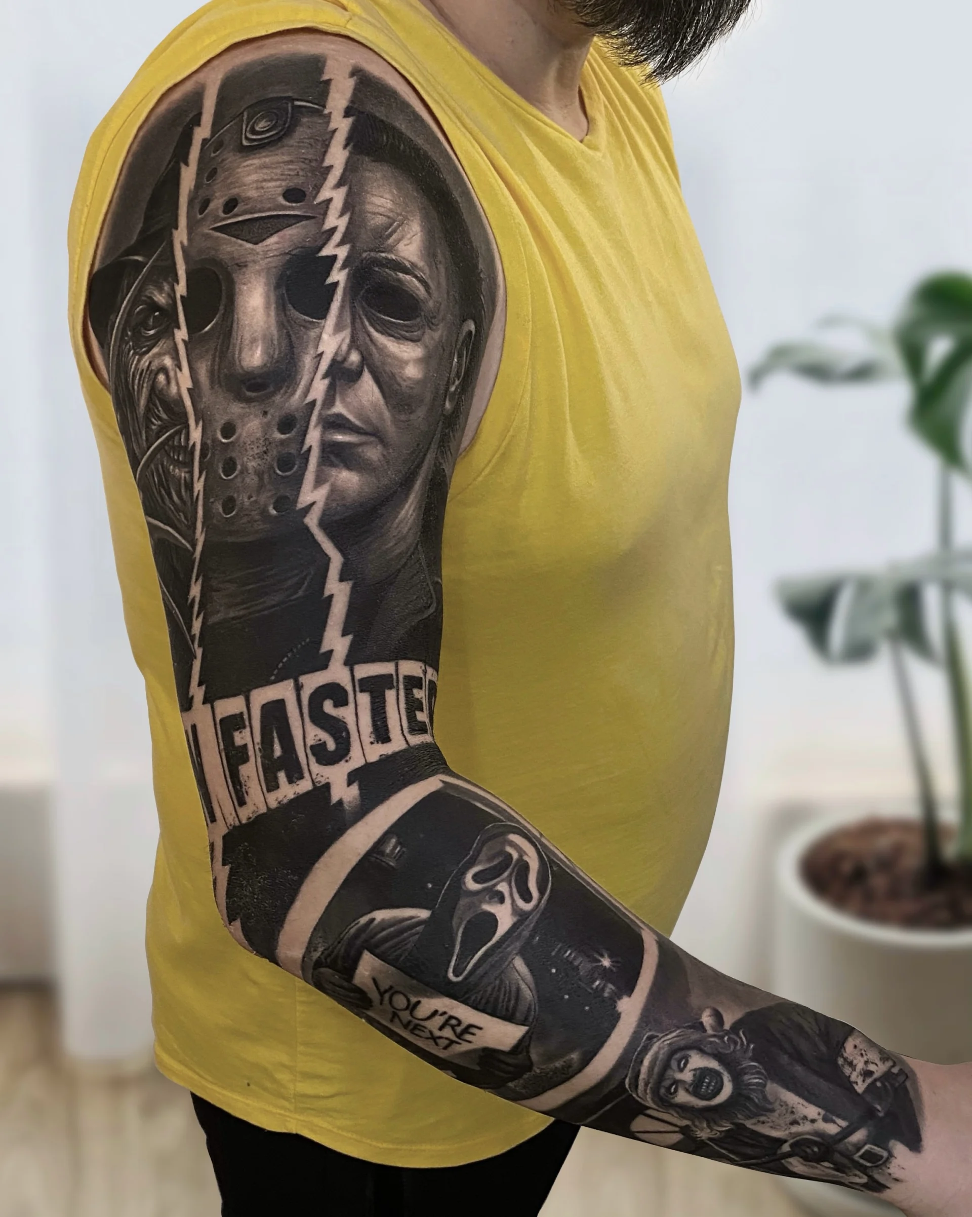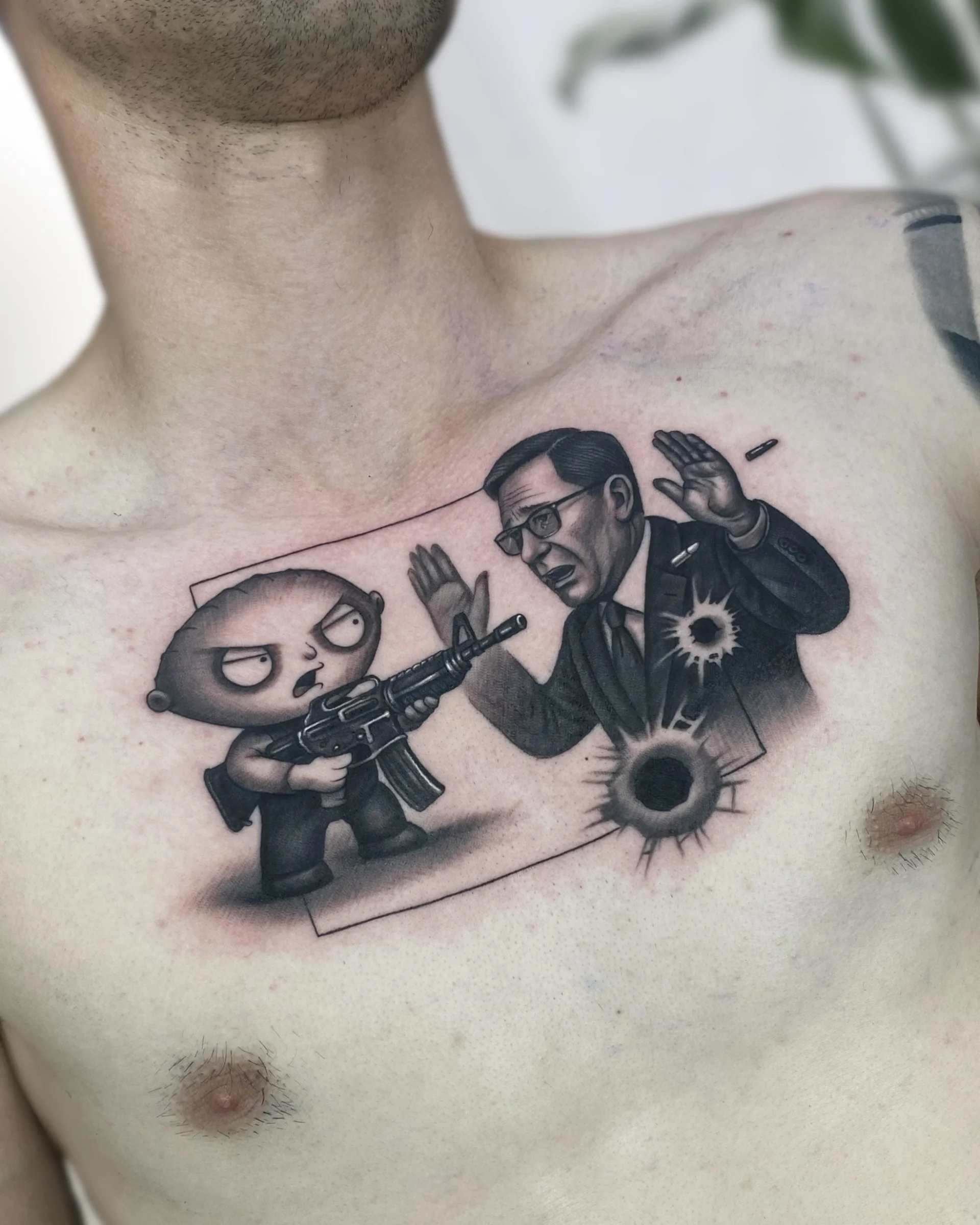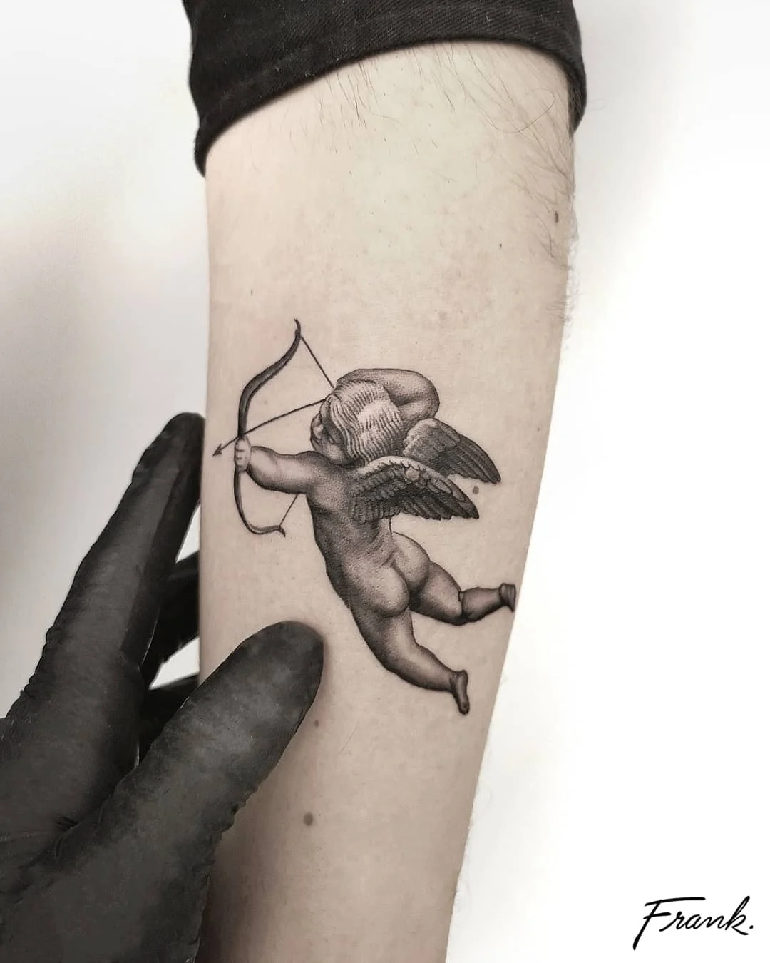 He specialises in black and white realistic tattoos, with a tendency to add a lot of geometric shapes.